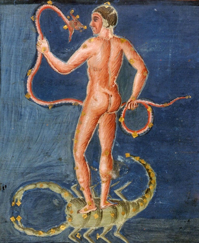 Ophiucus can be found in ancient Greek myth. He is Asclepius, the great god of medicine. He was raised by the centaur Chiron who is known as the wounded healer and who taught Asclepius the healing arts. When he was older, Asclepius healed a snake who in return imparted secret knowledge. This is how his symbol of the snake, entwining a wooden rod, came into being. The symbol of the snake was once the symbol of the healing arts until it was ‘mistakingly’ replaced in the early 20th century with the staff of Hermes, the god of thieves, lying, commerce and passage into the underworld. Known as the Caduceus, this staff has two snakes entwined around it and was adopted by the medical field in America.